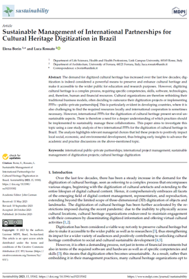 International public–private partnerships for the digitization of cultural heritage present several unsustainable aspects. There is therefore a need for a deeper understanding of which practices should be implemented to sustainably manage these collaborations. This research aims to investigate this topic using a case study analysis of two international PPPs for the digitization of modernist cultural heritage in Brazil. The analysis highlights relevant managerial choices that led these projects to positively impact local social, economic, and environmental development, thus bringing early insights to advance the academic and practice discussions on the above-mentioned topic.